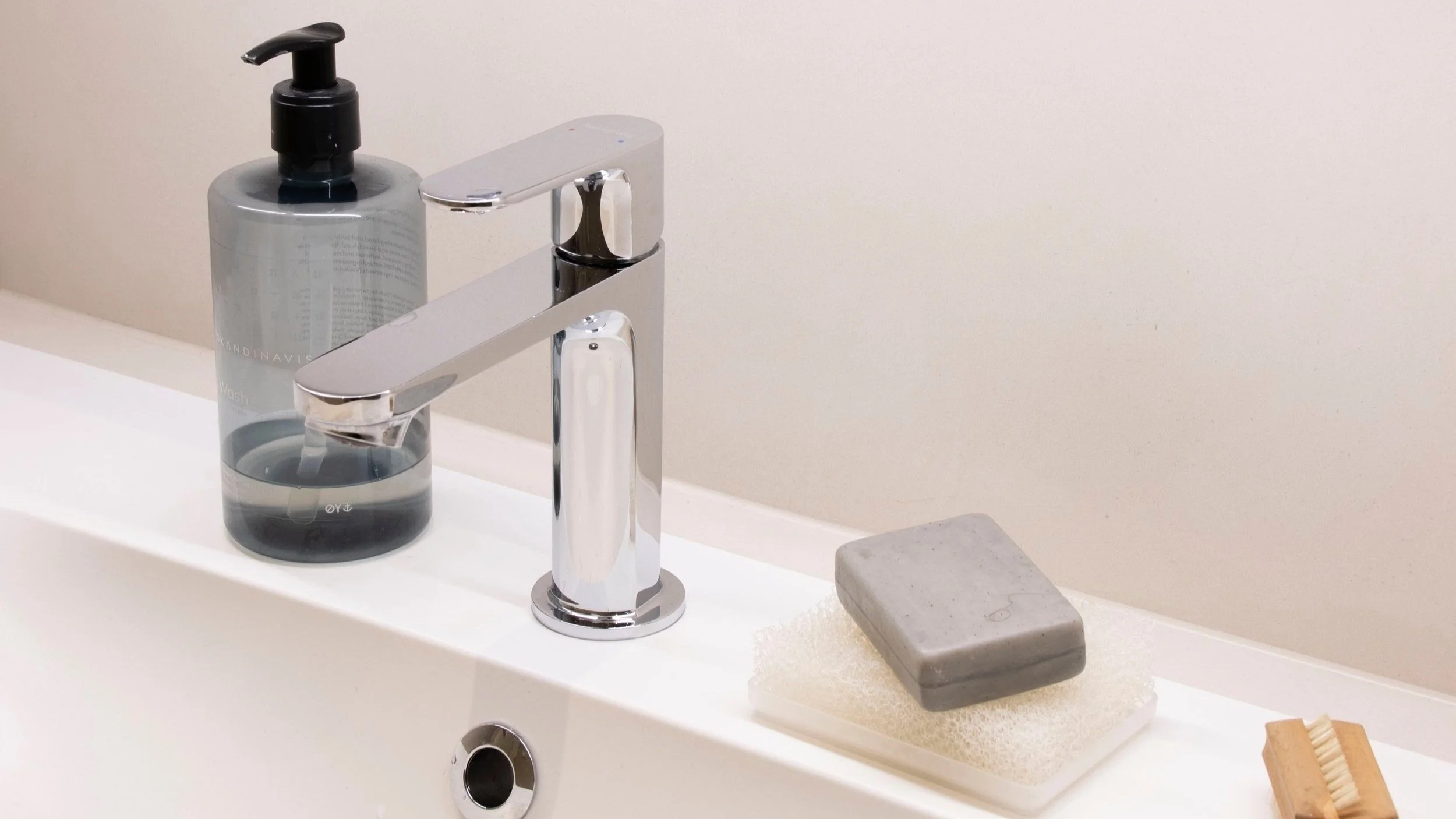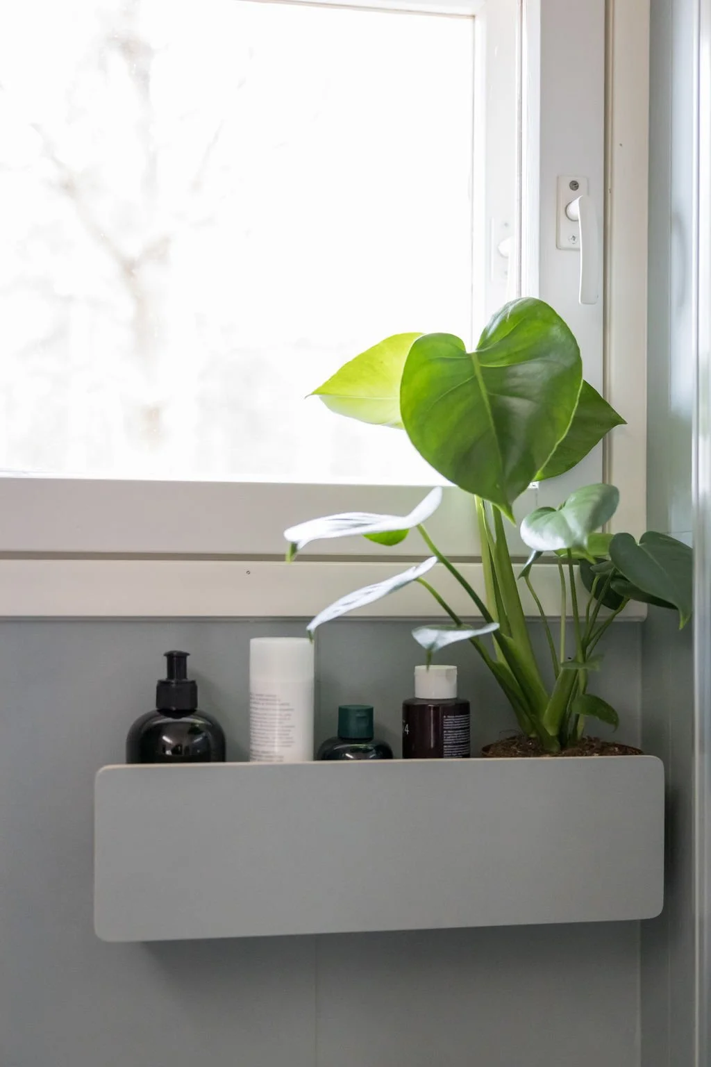 Kylpyhuoneen harmoninen tunnelma luotiin suurilla mattapintaisilla laatoilla ja hillityillä värivalinnoilla. Skarpit, ohuet laattasaumat, linjalattiakaivo peräseinän tuntumassa, tilaan sopivat kalusteet, rimapaneelikatto ja epäsuora valaistus tekevät kokonaisuudesta rauhallisen ja kutsuvan. Iso peilikaappi kätkee sisäänsä kaiken tarpeellisen ja peilipinta heijastaa kauniisti luonnonvaloa kylpyhuoneen ikkunasta. Seinästä seinään mitoitetut suihkulasit pitävät vesiroiskeet kurissa.
